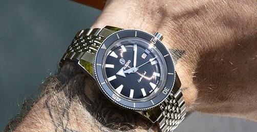 Rado surprised the audience with a very appealing diver’s model named ‘Captain Cook’. While the brand has gained its modern notoriety by mastering high-tech materials, mostly by using coloured ceramics, Rado has a rich history of interesting vintage models. Based on a watch released in 1962 with a distinctive case/bezel design, the brand reintroduced the Captain Cook and now enlarge