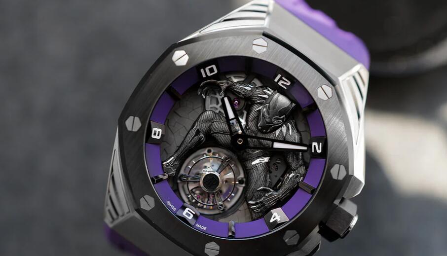 The Audemars Piguet Royal Oak Concept Black Panther Flying Tourbillon. 42mm sandblasted titanium case with satin-brushed titanium inserts. Black ceramic bezel and crown, sapphire crystal and caseback, water-resistant to 50m. Dial with hand-painted white-gold 3D Black Panther character, white-gold hour-markers with black PVD coating, purple inner bezel, white-gold Royal Oak hands with luminescent coating. Hand-wound Manufacture Calibre 2965 with a frequency of 3 Hz and 72 hours of power reserve. Flying Tourbillon, hours and minutes.