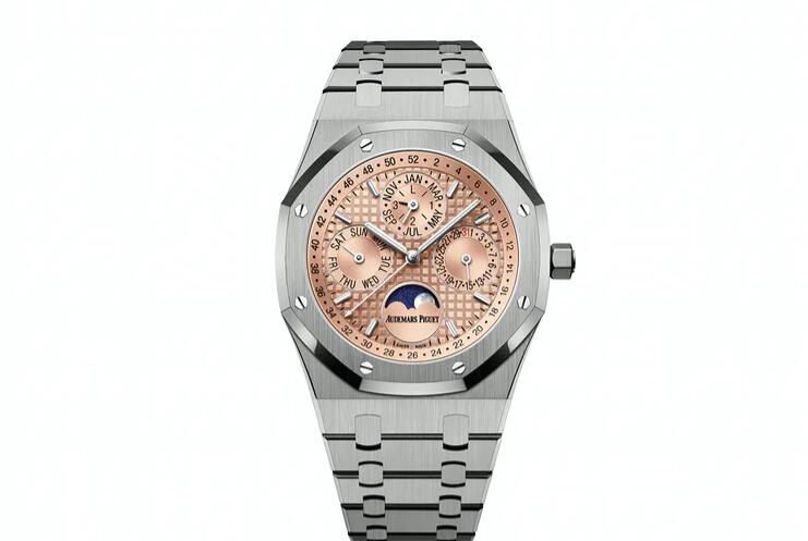 Anyway, the watch is on our radar now. So what do we know of it? Well, at a basic level it’s an AP Royal Oak Perpetual Calendar, a familiar enough piece, only now with a salmon Grande Tapisserie dial and subdials, and a titanium case and bracelet.