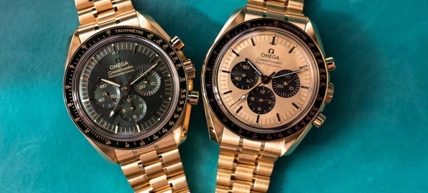 Offered in two dial variations and with either a matched gold bracelet or a lovely rubber strap, the new Omega Speedmaster Moonwatch Moonshine Gold (I’m going to go with Moonshine Speedmaster, as I don’t get paid by the word) comes in either a Moonshine gold dial with black subdials and accents and a black ceramic bezel, or a PVD green dial with gold accents and a green ceramic bezel.