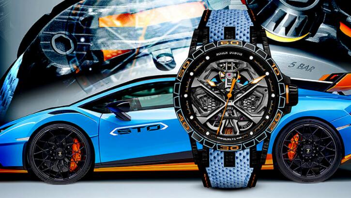 June 24, 2022Dubbed the Excalibur Spider Huracan STO, the timepiece has been displayed with the same Blue Laufey and California Orange color combination as the Huracan STO show car. The Roger Dubuis Excalibur Spider Huracan STO features a 45 mm skeletonized carbon case with rubber inlays topped with a titanium bezel and metallicized sapphire crystal, while the strap has perforated calfskin leather and a rubber interior liner. The main highlights are – an automatic RD630 calibre with a honeycomb motif, which Roger Dubuis developed specifically for its tandem with Lamborghini Squadra Corse. The movement is from a 12-degree-angled balance wheel coupled with a 360-degree oscillating weight. It has a lot of resemblance to that of the Huracan like the upper calibre has a strut-bar design bridge as seen in the V10 engine, the bezels are finished in black DLC titanium with a sleek carbon case with rubber inlays. The case back is also inspired by the wheels of the Huracan.