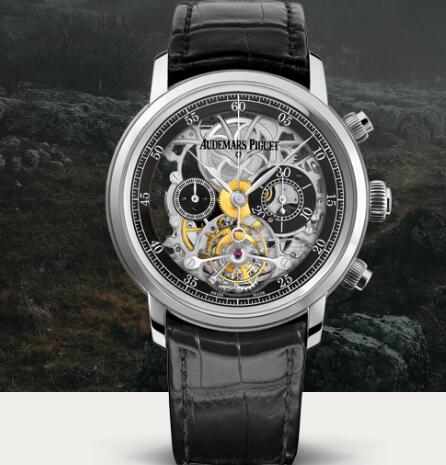 Black dial, openworked, satin-brushed, black counters, white gold hands.