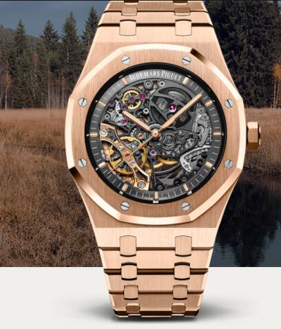 WATCH Ref #15407OR.OO.1220OR.01 CASE 18-carat pink gold case, glareproofed sapphire crystal and caseback, screw-locked crown, water-resistant to 50 m. CASE SIZE 41 mm WATER RESISTANCE 50 m CASE THICKNESS 9.9 mm DIAL Slate grey openworked dial, pink gold applied hour-markers and Royal Oak hands with luminescent coating. BRACELET 18-carat pink gold bracelet with AP folding clasp.