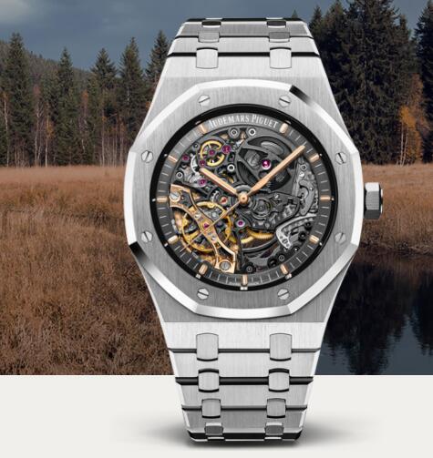 WATCH Ref #15407ST.OO.1220ST.01 CASE Stainless steel case, glareproofed sapphire crystal and caseback, screw-locked crown, water-resistant to 50 m. CASE SIZE 41 mm WATER RESISTANCE 50 m CASE THICKNESS 9.9 mm DIAL Slate grey openworked dial, pink gold applied hour-markers and Royal Oak hands with luminescent coating. BRACELET Stainless steel bracelet with AP folding clasp.