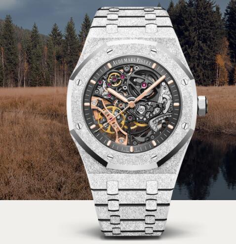WATCH Ref #15407BC.GG.1224BC.01 CASE Hammered 18-carat white gold case, glareproofed sapphire crystal and caseback, screw-locked crown. CASE SIZE 41 mm WATER RESISTANCE 50 m CASE THICKNESS 10 mm DIAL Openworked slate grey dial, pink gold applied hour-markers and Royal Oak hands with luminescent coating. BRACELET Hammered 18-carat white gold bracelet with AP folding clasp.