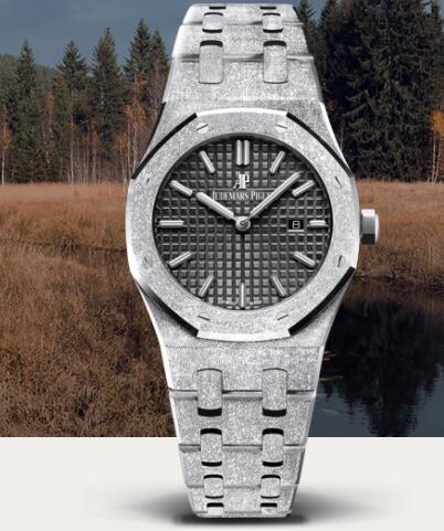 WATCH Ref #67653BC.GG.1263BC.02 CASE Hammered 18-carat white gold case, glareproofed sapphire crystal. CASE SIZE 33 mm WATER RESISTANCE 50 m CASE THICKNESS 7 mm DIAL Black dial with “Grande Tapisserie” pattern, white gold applied hour-markers and Royal Oak hands with luminescent coating. BRACELET Hammered 18-carat white gold bracelet with AP folding clasp.