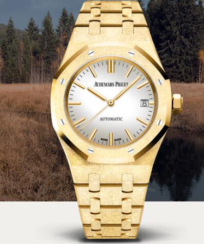 WATCH Ref #15454BA.GG.1259BA.02 CASE Hammered 18-carat yellow gold case, glareproofed sapphire crystal and caseback, screw-locked crown. CASE SIZE 37 mm WATER RESISTANCE 50 m CASE THICKNESS 9.8 mm DIAL Silver-toned mirror dial, yellow gold applied hour-markers and Royal Oak hands with luminescent coating. BRACELET Hammered 18-carat yellow gold bracelet with AP folding clasp.