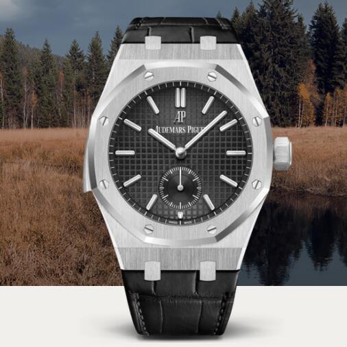 WATCH Ref #26591PT.OO.D002CR.01 CASE 950 platinum case, glareproofed sapphire crystal, screw-locked crown. CASE SIZE 42 mm WATER RESISTANCE 20 m CASE THICKNESS 14 mm DIAL Black dial with “Grande Tapisserie” pattern, white gold applied hour-markers and Royal Oak hands with luminescent coating. BRACELET Hand-stitched “large square scale” black alligator strap with 950 platinum AP folding clasp.