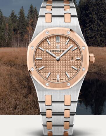 WATCH Ref #67650SR.OO.1261SR.01 CASE Stainless steel case, glareproofed sapphire crystal, 18-carat pink gold bezel, crown and links, water-resistant to 50 m. CASE SIZE 33 mm WATER RESISTANCE 50 m CASE THICKNESS 7 mm DIAL Pink gold-toned dial with “ Grande Tapisserie ” pattern, white gold applied hour-markers and Royal Oak hands with luminescent coating. BRACELET Stainless steel and 18-carat pink gold bracelet with stainless steel AP folding clasp.