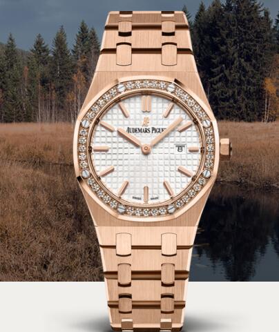WATCH Ref #67651OR.ZZ.1261OR.01 CASE 18-carat pink gold case, glareproofed sapphire crystal, diamond-set bezel CASE SIZE 33 mm WATER RESISTANCE 50 m CASE THICKNESS 7 mm DIAL Silver-toned dial with “Grande Tapisserie” pattern, pink gold applied hour-markers and Royal Oak hands with luminescent coating BRACELET 18-carat pink gold bracelet with AP folding clasp SETTING 40 brilliant-cut diamonds, ~0.71 carats (bezel).
