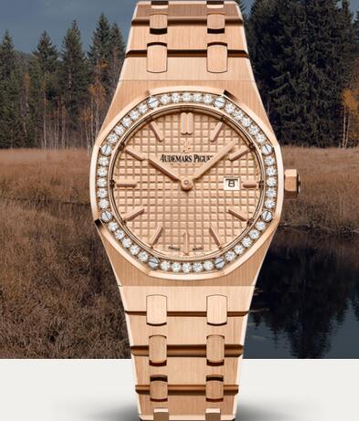 WATCH Ref #67651OR.ZZ.1261OR.03 CASE 18-carat pink gold case, glareproofed sapphire crystal, diamond-set bezel. CASE SIZE 33 mm WATER RESISTANCE 50 m CASE THICKNESS 7 mm DIAL Pink gold-toned dial with “Grande Tapisserie” pattern, pink gold applied hour-markers and Royal Oak hands with luminescent coating. BRACELET 18-carat pink gold bracelet with AP folding clasp. SETTING 40 brilliant-cut diamonds; ~0.73 carats (bezel).