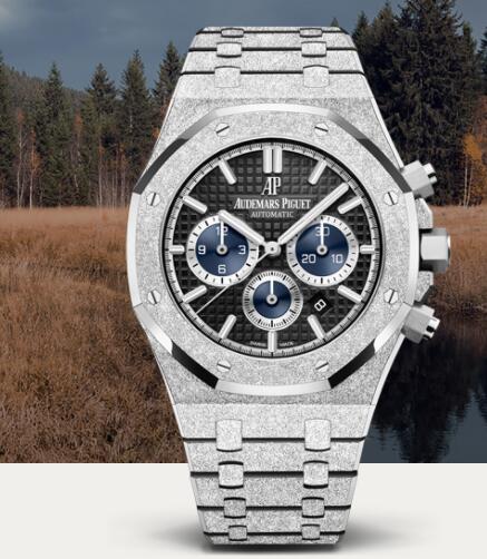 WATCH Ref #26331BC.GG.1224BC.03 CASE Hammered 18-carat white gold case, glareproofed sapphire crystal, screw-locked crown. CASE SIZE 41 mm WATER RESISTANCE 50 m CASE THICKNESS 11 mm DIAL Black dial with “Grande Tapisserie” pattern, grey blue counters, white gold applied hour-markers and Royal Oak hands with luminescent coating. BRACELET Hammered 18-carat white gold bracelet with AP folding clasp.