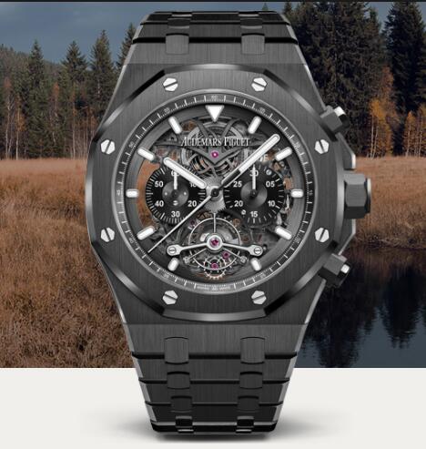 ROYAL OAK TOURBILLON CHRONOGRAPH OPENWORKED SPECIFICATIONS INTERACTIVE USER GUIDE WATCH Ref #26343CE.OO.1247CE.01 CASE Black ceramic case, glareproofed sapphire crystal and caseback. CASE SIZE 44 mm WATER RESISTANCE 20 m CASE THICKNESS 13.2 mm DIAL Openworked, satin-brushed black dial, black counters, white gold applied hour-markers and Royal Oak hands with luminescent coating, black inner bezel. BRACELET Black ceramic bracelet with titanium AP folding clasp. Two additional rubber straps; one in two-tone rubber strap: black on top and grey on the sides and underside, another in full black rubber.