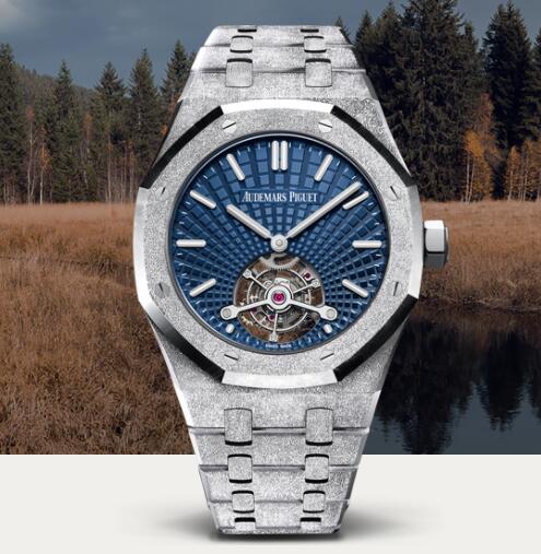 WATCH Ref #26520BC.GG.1224BC.01 CASE Hammered 18-carat white gold case, glareproofed sapphire crystal and caseback. CASE SIZE 41 mm WATER RESISTANCE 50 m CASE THICKNESS 8.95 mm DIAL Blue dial with “Tapisserie Evolutive” pattern, white gold applied hour-markers and Royal Oak hands with luminescent coating. BRACELET Hammered 18-carat white gold bracelet with AP folding clasp.
