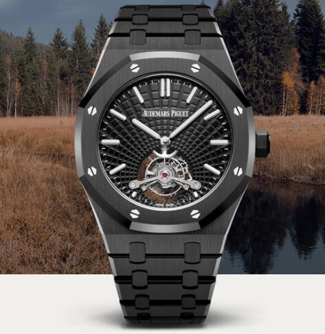 WATCH Ref #26522CE.OO.1225CE.01 CASE Black ceramic case, glareproofed sapphire crystal and black ceramic caseback. CASE SIZE 41 mm WATER RESISTANCE 50 m CASE THICKNESS 9 mm DIAL Black dial with “Tapisserie Evolutive” pattern, white gold applied hour-markers and Royal Oak hands with luminescent coating. BRACELET Black ceramic bracelet with titanium AP folding clasp.