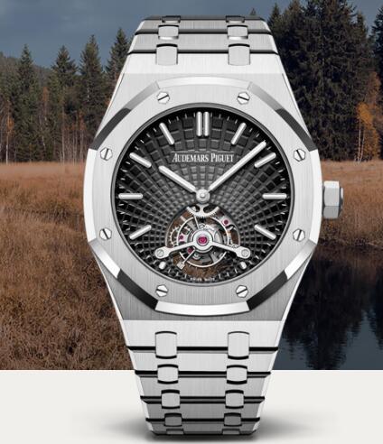 Smoked grey dial with “Evolutive Tapisserie” pattern, white gold applied hour-markers and Royal Oak hands with luminescent coating.