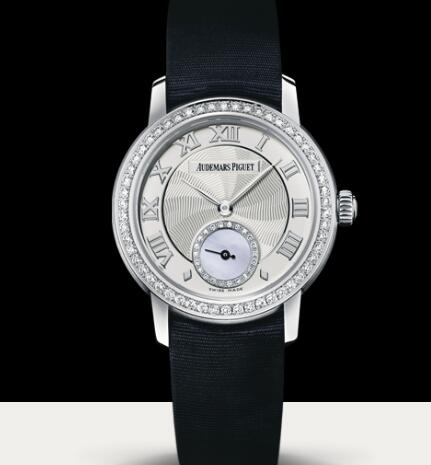 Silver-toned dial with “spirale” decorative pattern, white mother of pearl small seconds counter set with diamonds, white gold applied Roman numerals and hands