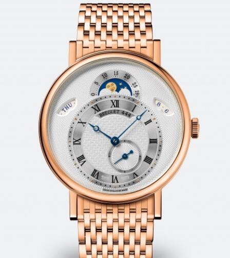 Classique wristwatch in 18-carat gold. Selfwinding movement showing the date, the day and the phases and age of the moon. Balance spring in silicon. Dial in gold, hand-engraved on a rose engine. Off-centred chapter ring. Seconds subdial. Sapphire caseback. Water-resistant to 3 bar (30m). Diameter: 39 mm.