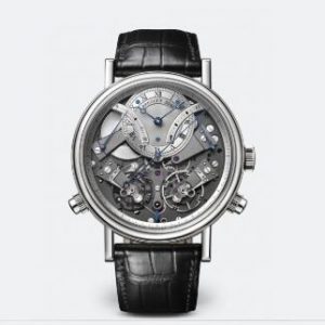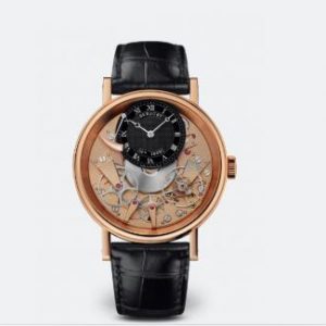 Case in 18-carat rose gold with a finely fluted case band. Sapphire case back. 41 mm diameter. Welded lugs with screw bars. Water-resistant to 3 bar (30m). Dial in 18-carat gold, silvered and engine-turned in four different patterns. Individually numbered and signed Breguet. Hours chapter with Roman numerals on a sapphire disc. Breguet open-tipped hands in blued steel. Retrograde dates indication at 12 o’clock, days at 9 o’clock, and months and leap years at 3 o’clock. Small seconds on the tourbillon axis. Manually wound movement with tourbillon and perpetual calendar. Numbered and signed Breguet. Cal. 558QP2. 14 ½ lines, 21 jewels. Power reserve of 50 hours. Lateral lever escapement and balance with adjustment screws on a Breguet spring. Frequency 2,5Hz. Adjusted in six positions. Leather strap with a triple-blade folding clasp. Also available in platinum.