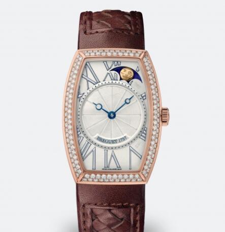 Héritage wristwatch in 18-carat white gold. Curved tonneau-shaped case. Bezel set with 140 diamonds, approx. 1.14 cts. Self-winding movement. Retrograde moon-phase indicator. Balance-spring in silicon. Cambered frosted silvered and natural mother-of-pearl dial, hand-engraved on a rose engine. Water-resistant to 3 bar ( 30 m ). Also in rose gold. Leather strap. Available with white gold bracelet. Dimensions : 35 x 25 mm.