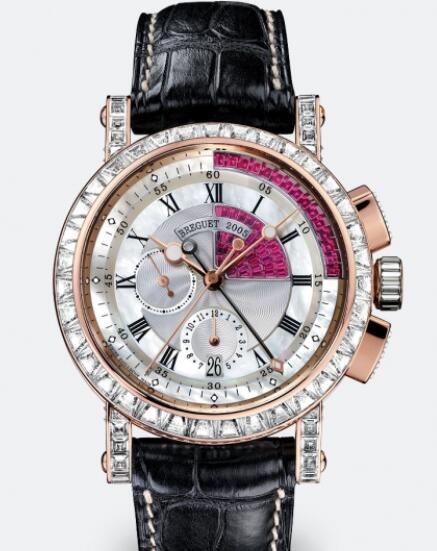 Marine chronograph in 18-carat rose gold. Self-winding movement with date and small seconds. Centre chronograph minutes and seconds. Bezel, lugs and case band paved with 158 baguette-cut diamonds, approx. 10.45 cts . 15-minute sector paved with 55 baguette-cut rubies, approx. 1.12 cts. Natural mother-of-pearl dial, hand-engraved on a rose engine. Sapphire case back. Screw-locked crown. Water-resistant to 3 bar ( 30 m ). Available with a 15-minute sector paved with baguette-cut diamonds. Diameter : 42 mm.