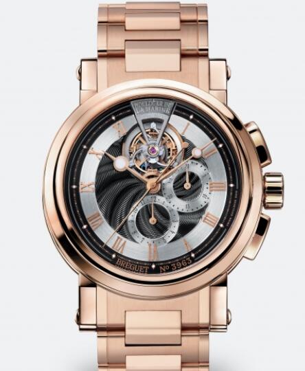 Marine chronograph “Grande Complication” in 18-carat rose gold, with tourbillon. Hand wound movement. Balance spring, lever and escape wheel in silicon. Tourbillon carriage in titanium. Running seconds on the tourbillon shaft. 30-minute and 12-hour totalizers. Black rhodium dial, hand-engraved on a rose engine. Sapphire case back. Water-resistant to 10 bar ( 100 m ). Diameter : 42 mm. Available with gold bracelet.