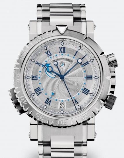 Marine Royale alarm wristwatch in 18-carat rose gold. Self-winding movement with date. Alarm power-reserve indicator. Self-winding alarm on/off indicator. Rose-gilded gold dial, hand-engraved on a rose engine. Sapphire caseback. Screw-locked crown. Water-resistant to 30 bar ( 300 m ). Diameter : 45 mm. Available with gold bracelet