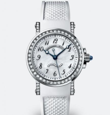 Marine wristwatch in 18-carat white gold. Bezel and lugs set with 58 diamonds, approx. 1.25 cts. Self-winding movement. Natural mother-of-pearl dial, hand-engraved on a rose engine and set with 10 diamonds, approx. 0.025 ct. Sapphire caseback. Water-resistant to 3 bar ( 30 m ). Also in yellow gold. Diameter : 30 mm.