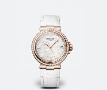 Available in 18-carat rose gold or white gold with bezel set with 50 diamonds, approx. 1.165ct, natural mother-of-pearl dial, hand-engraved on a rose engine with “marea” motif, and oscillating weight set with 31 diamonds.