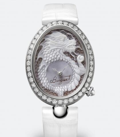 Reine de Naples wristwatch in 18-carat white gold. Bezel set with 40 diamonds, approx. 2.42 cts. Self-winding movement. Dial made out of seashell, crafted as a cameo. Sapphire caseback. Water-resistant to 3 bar ( 30 m ). Dimensions : 40 x 31.95 mm. Available with a dial displaying Chinese zodiac signs. Available in white gold with a hand-engraved 21-carat white gold dial set with 54 diamonds. Available in rose gold with a hand-engraved 24-carat yellow gold dial set with 58 brown diamonds.