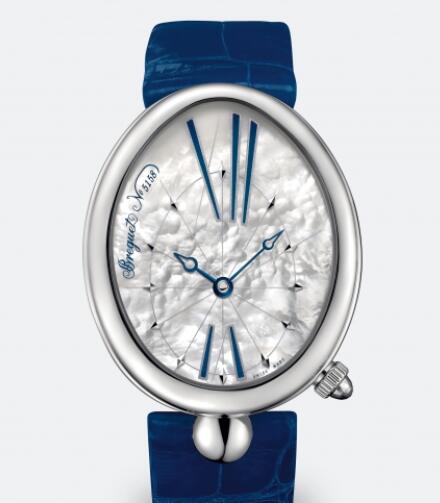 Reine de Naples wristwatch in steel. Self-winding movement. Balance spring and escapement in silicon. White natural mother-of-pearl dial with Replica Breguet Arabic numerals. Sapphire caseback. Water-resistant to 3 bar ( 30 m ). Dimensions : 43.75 x 35.50 mm. Also with blue natural mother-of-pearl. Available on a steel bracelet.