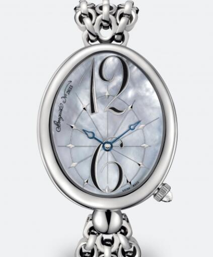 Reine de Naples wristwatch in steel. Self-winding movement. Balance spring and escapement in silicon. White natural mother-of-pearl dial with Replica Breguet Arabic numerals. Sapphire caseback. Water-resistant to 3 bar ( 30 m ). Dimensions : 43.75 x 35.50 mm. Also with blue natural mother-of-pearl. Available on a steel bracelet.