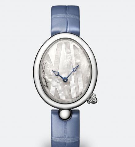 Case in steel, cambered ovoid with a delicately fluted case band. Sapphire-crystal case back. Dimensions 32.7 x 27.3mm. Water resistant to 3 bar (30m). Dial in grained natural white mother-of-pearl. Off-centre chapter ring at 6 o’clock with Roman numerals in white natural mother-of-pearl marquetry. Self-winding movement. Cal. 586/1. 38 hours power reserve. In-line Swiss lever escapement. Breguet balance on a silicon spring. Balance frequency 3Hz.