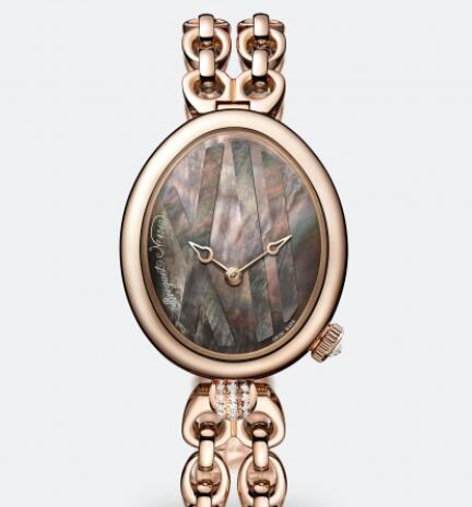 Case in 18-carat rose gold, cambered ovoid with a delicately fluted case band. Crown set with a briolette diamond (approx. 0,15 ct). Attachment set with 16 brilliant-cut diamonds (approx. 0,08 ct). Sapphire-crystal case back. Dimensions 32.7 x 27.3mm. Water resistant to 3 bar (30m). Dial in Tahitian mother-of-pearl. Off-centre chapter ring at 6 o’clock with Roman numerals in Tahitian mother-of-pearl marquetry. Self-winding movement. Cal. 586/1. 38 hours power reserve. In-line Swiss lever escapement. Breguet balance on a silicon spring. Balance frequency 3Hz.
