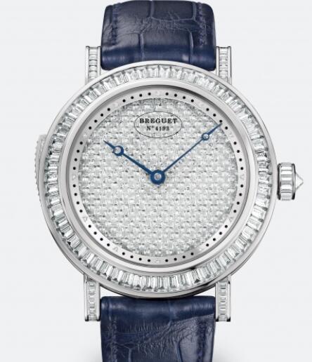 Classique “Grande Complication” minute repeater wristwatch in 18-carat white gold. Hand-wound movement, engraved by hand. Bezel, case band, repeating-lever and lugs set with 160 baguette cut diamonds, approx. 10.82 cts.
