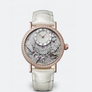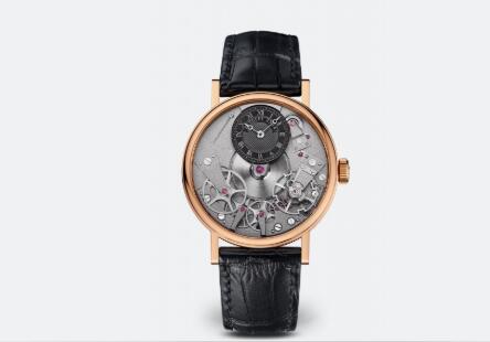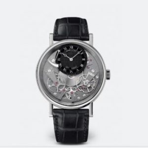 Tradition wristwatch in 18-carat white gold. Hand-wound movement with power reserve indicated above and underneath. Off-centred black dial in gold, hand-engraved on a rose engine. Sapphire caseback. Water-resistant to 3 bar ( 30 m ). Diameter : 37 mm. Available in rose gold.