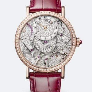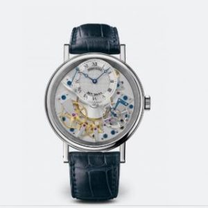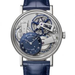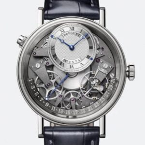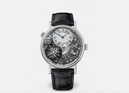 Tradition GMT watch in 18-carat gold. Anthracite hand-wound movement. Second time-zone indicator. Day/night indicator. Off-centred local time subdial in silvered gold, hand-engraved on a rose engine. Black off-centred reference time subdial in gold, hand-engraved on a rose engine. Power reserve indicator on the back of the movement. Silicon Breguet balance-spring. Sapphire crystal caseback. Water-resistant to 3 bar (30 m). Diameter: 40 mm.