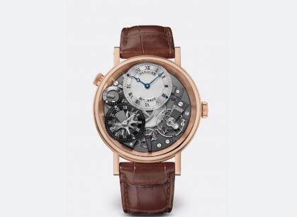 Tradition GMT watch in 18-carat gold. Anthracite hand-wound movement. Second time-zone indicator. Day/night indicator. Off-centred local time subdial in silvered gold, hand-engraved on a rose engine. Black off-centred reference time subdial in gold, hand-engraved on a rose engine. Power reserve indicator on the back of the movement. Silicon Breguet balance-spring. Sapphire crystal caseback. Water-resistant to 3 bar (30 m). Diameter: 40 mm.