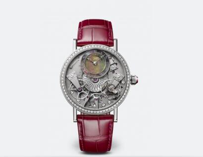 Tradition watch in 18-carat gold. Bezel set with 68 diamonds weighing approx. 0.895 ct. Self-winding movement with retrograde seconds. Silicon Breguet balance-spring. Off-centred dial in natural mother-of-pearl, engine-turned by hand. Sapphire crystal case back. Water-resistant to 3 bar (30 m). Diameter: 37 mm.