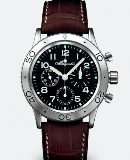 Type XX Aéronavale flyback chronograph in steel. Self-winding movement, subdial for the seconds. 30-minute and 12-hour totalizers. Graduated turning bezel. Luminous hands and numerals. Screw-locked crown. Water-resistant to 10 bar ( 100 m ). Diameter : 39 mm. Available with steel bracelet.