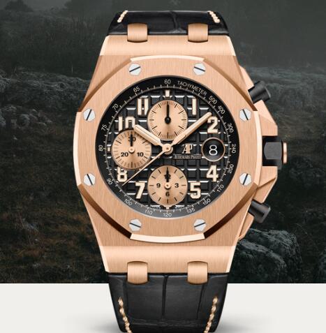 Black dial with “Méga Tapisserie” pattern, pink gold-toned counters, pink gold applied hour-markers and Royal Oak hands with luminescent coating, black inner bezel.