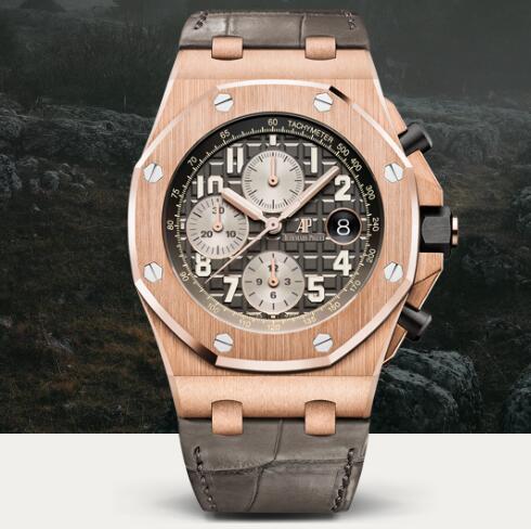 Grey ruthenium-toned dial with “Méga Tapisserie” pattern, ivory-toned counters, pink gold-toned Arabic numerals with beige luminescent coating, pink gold Royal Oak hands with beige luminescent coating, grey ruthenium-toned inner bezel.