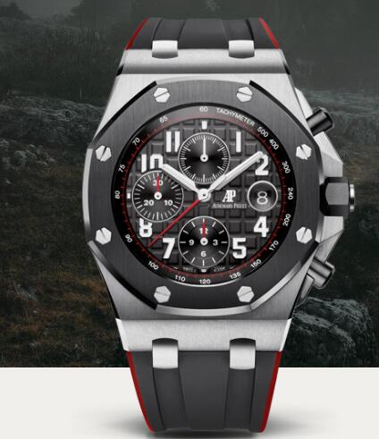 Black dial with “Méga Tapisserie” pattern, black counters, Arabic numerals with luminescent coating, white gold Royal Oak hands with luminescent coating, black inner bezel.