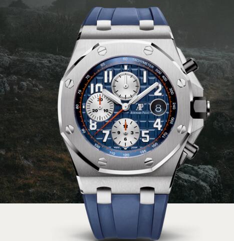 Blue dial with “Méga Tapisserie” pattern, silver-toned counters, white Arabic numerals with luminescent coating, white gold Royal Oak hands with luminescent coating, blue inner bezel.