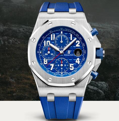 Blue dial with “Méga Tapisserie” pattern, blue counters, Arabic numerals with luminescent coating, white gold Royal Oak hands with luminescent coating, blue inner bezel.