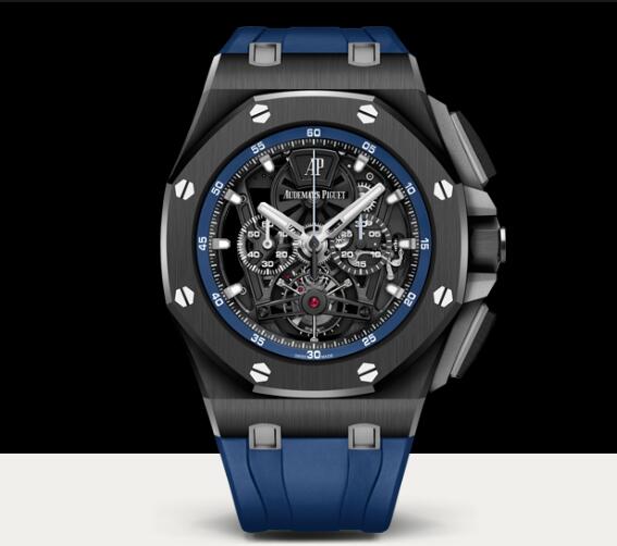 Sapphire dial, black and white transfer counters, white gold Royal Oak hands with luminescent coating, blue inner bezel.