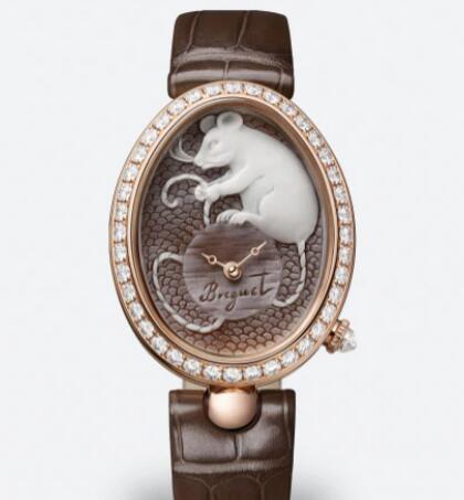 Reine de Naples Cameo wristwatch in 18-carat rose gold. Bezel set with 40 diamonds, approx. 2.42cts. Crown set with a briolette diamond, approx. 0.26ct. Self-winding movement. Balance spring, lever and escape wheel in silicon. Dial cameo carved out natural seashell, displaying the Chinese zodiac sign of the rat. Sapphire caseback. Water-resistant to 3 bar (30m). Dimensions: 40×31.95mm.