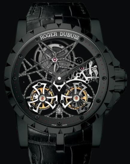 Replica Roger Dubuis Excalibur Double Tourbillon Volant Squelette RDDBEX0364 Watch Black Titanium – Black Alligator Strap
