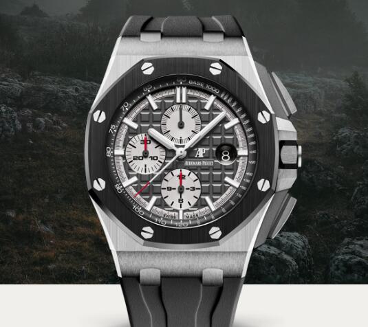 Slate grey dial with “Méga Tapisserie” pattern, rhodium-toned counters, white gold applied hour-markers and Royal Oak hands with luminescent coating, slate grey inner bezel.