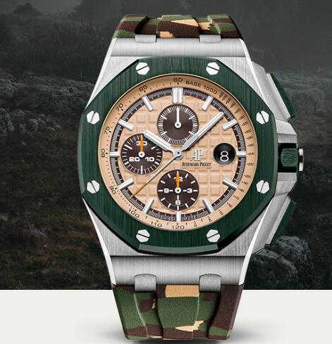 Beige dial with “Méga Tapisserie” pattern, brown counters, brown external zone, white gold applied hour-markers and Royal Oak hands, beige inner bezel.